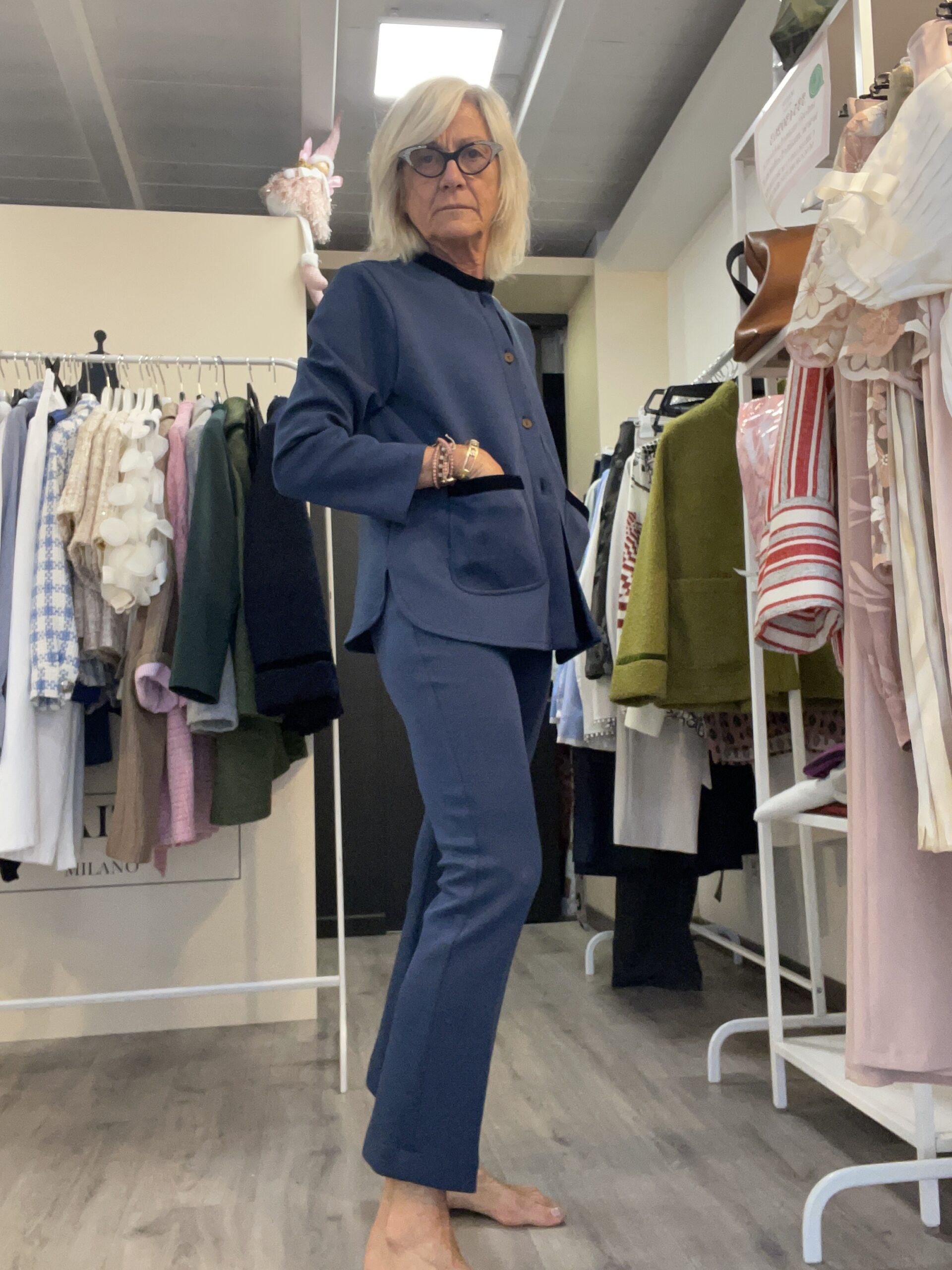 Completo composto da giacca destrutturata, confortevole come una felpa, ma elegante come una giacca vera e propria, profili in velluto a due colori + classico pantalone “trombetta” dalla vestibilità slim, leggermente svasato sul fondo